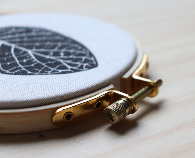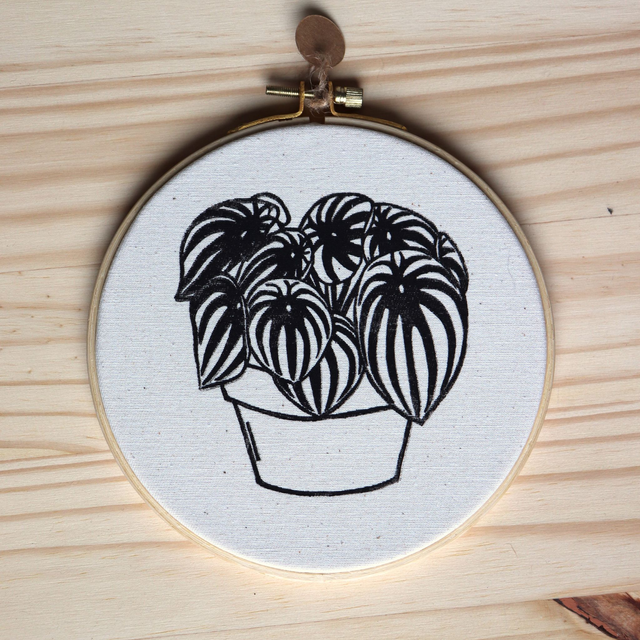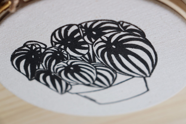 Impression sur tissu Peperomia Watermelon collée sur un cercle de broderie en bambou de 16 cm de diamètre.