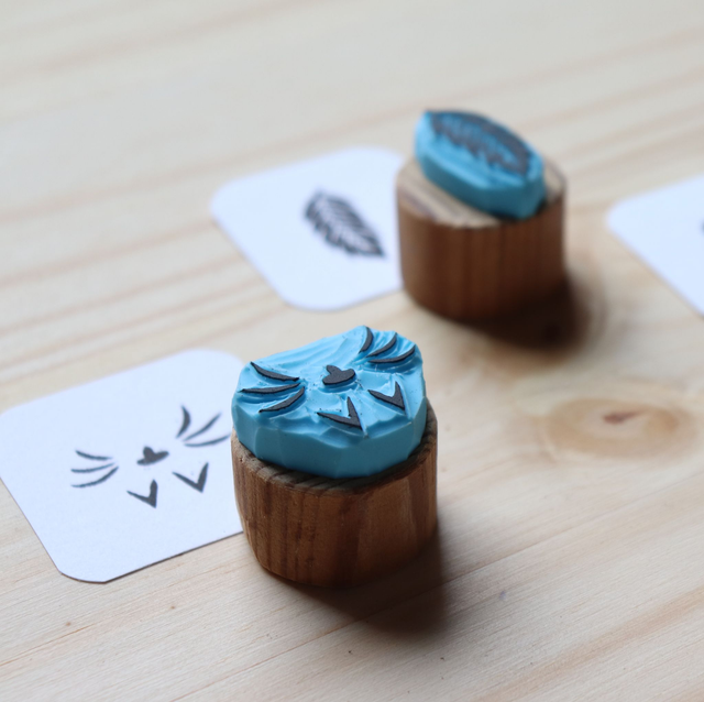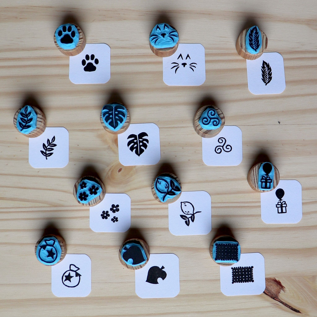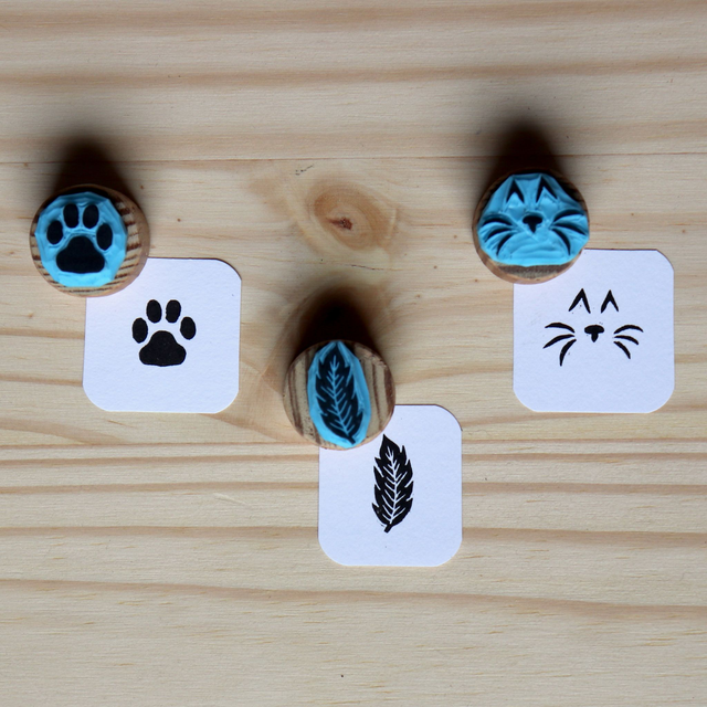 Tampons gravés à la main sur gomme à graver collés sur une chute de bois.